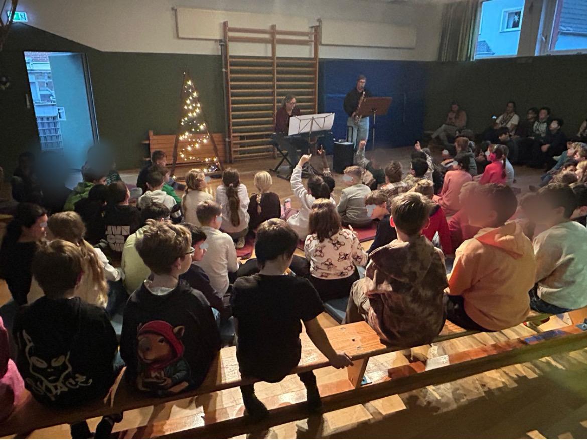 Auch sonst herrschte in der MES vorweihnachtliche Stimmung. Es fanden zwei Adventsfeiern in der dekorierten Turnhalle statt (einmal für die SEP 1 und 2 und einmal für die Klassen SEP 3, Klasse 3 und 4), in denen gemeinsam Weihnachtslieder gesungen wurden. Musikalisch unterstützt wurden die Kinder dabei von drei Lehrerinnen: eine am Klavier, eine am Saxophon und eine an der Klarinette.