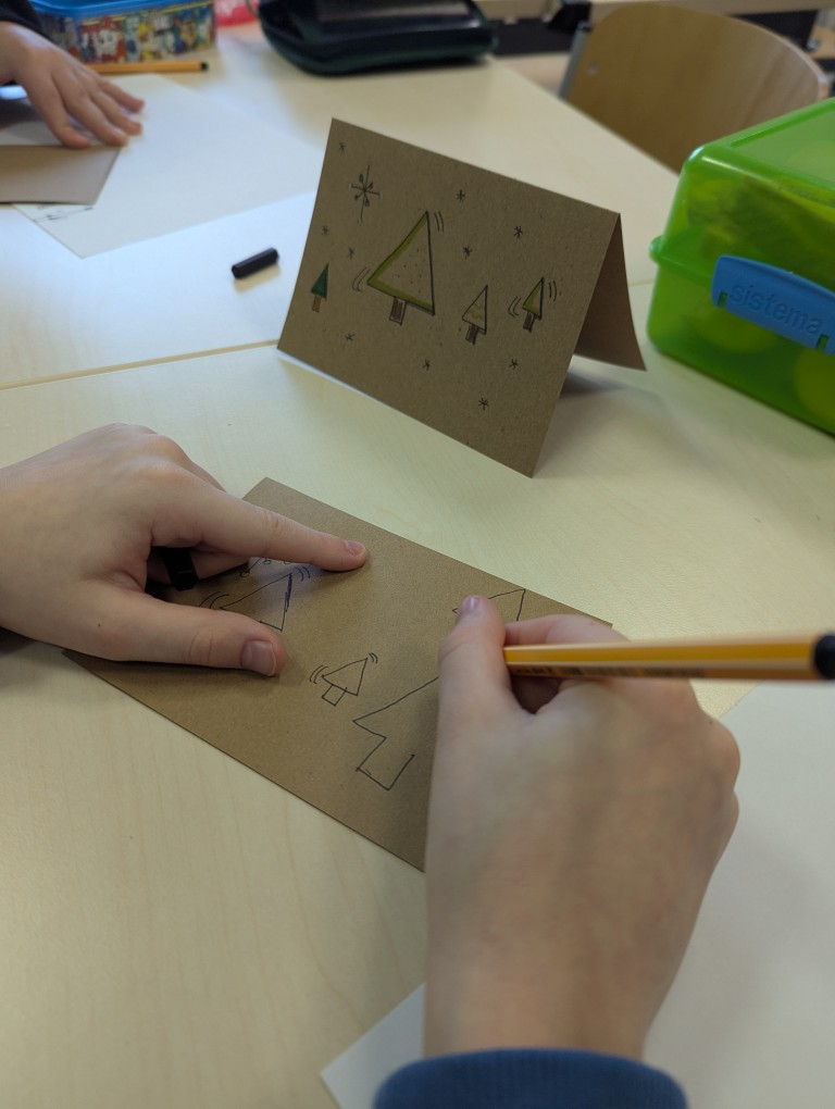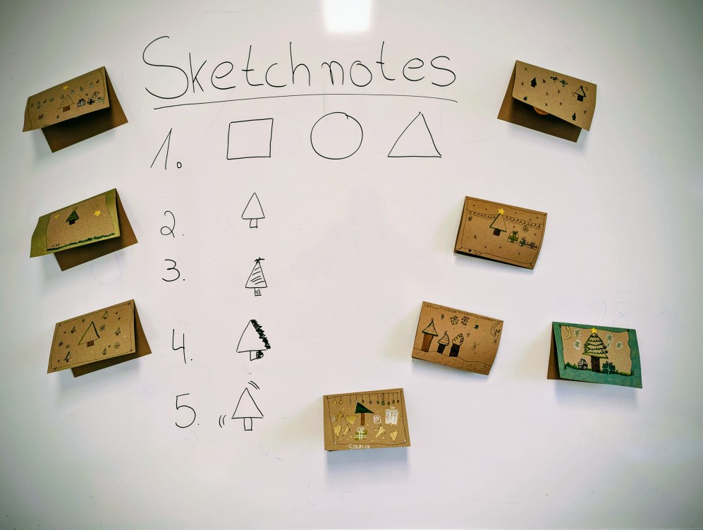 In der Vorweihnachtszeit haben einige Kinder besondere Weihnachtskarten gestaltet: Sie haben Sketchnotes gemalt. Sketchnotes sind Notizen mit kleinen Zeichnungen und einfachen Wörtern. Es geht darum, Gedanken und Ideen sichtbar zu machen. So entstanden persönliche und kreative Karten, die zeigen, wie vielfältig Gedanken und Ideen sein können. Wir freuen uns sehr über die tollen Ergebnisse und wünschen allen eine schöne Weihnachtszeit.